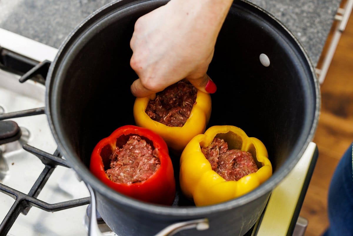 - Bring pot to a boil on high heat then reduce to low and cover with lid. Cook on low for 45 minutes or until peppers are tender and rice and meat is cooked through. Serve with Lebanese Laban Cucumber Yogurt Sauce.