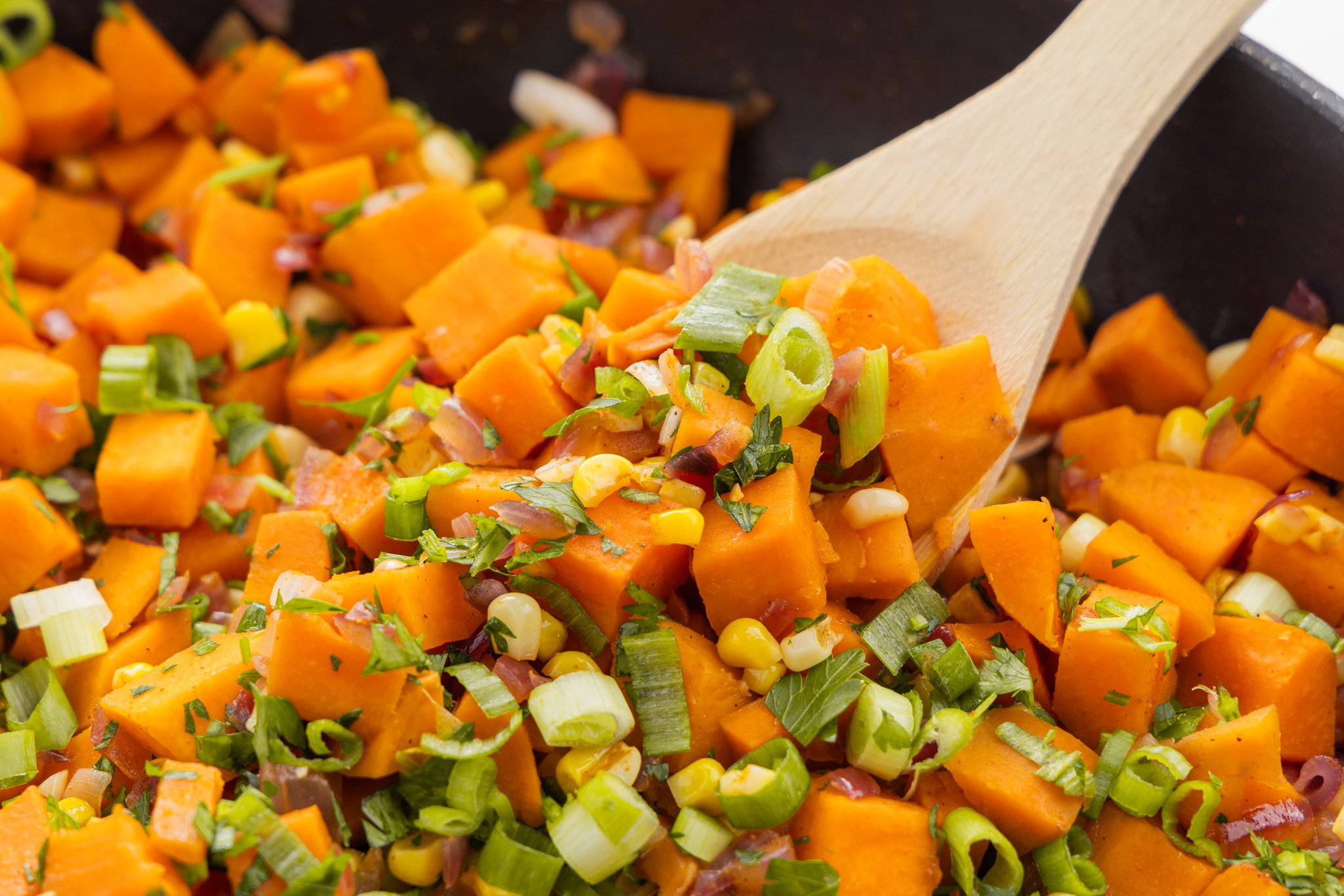 Stir in the scallions, and top with fresh parsley. Serve and enjoy your Sweet Potato and Corn Succotash!