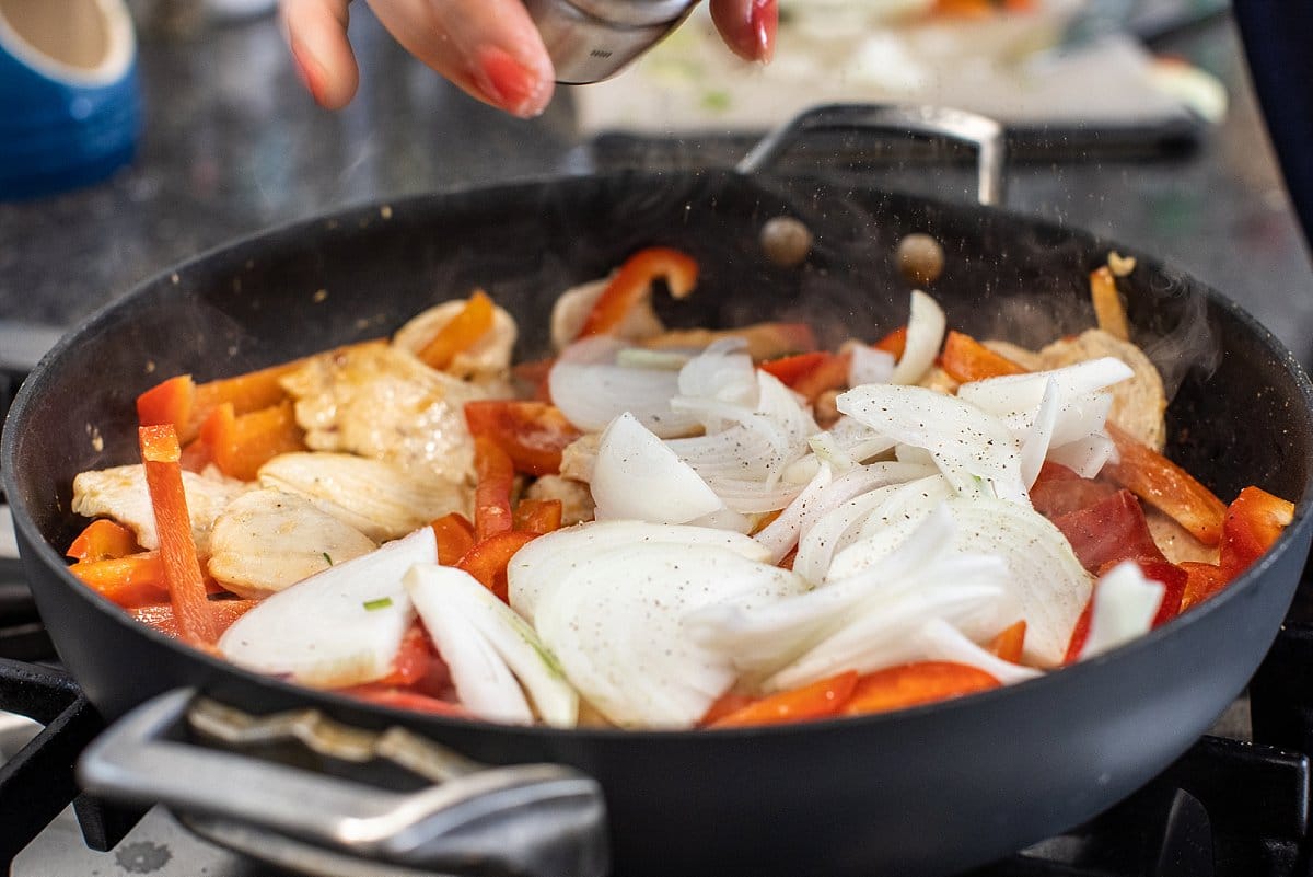 - Add peppers and onions to the pan along with a pinch of salt and pepper. Stir-fry, stirring frequently, until tender, about 5 minutes.