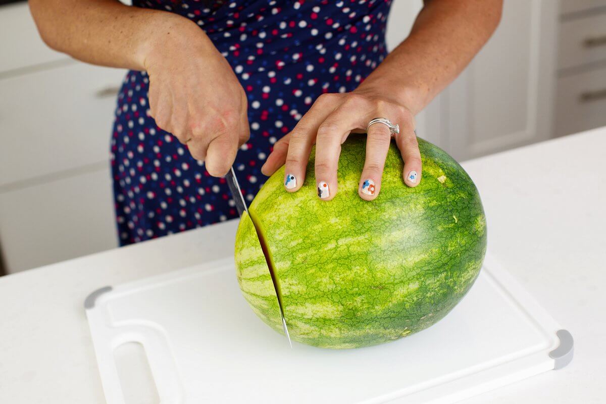 If you follow the natural curve of the watermelon, you’ll see little to no waste of the red flesh.