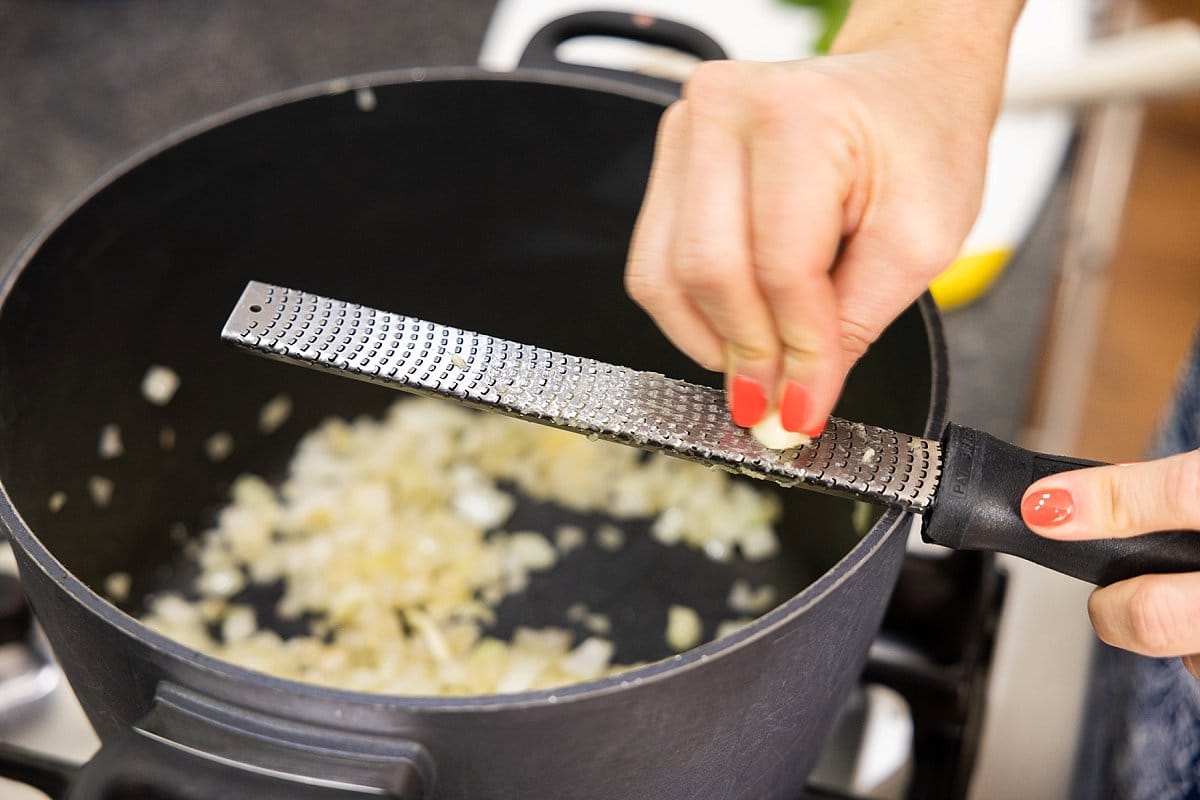 - Heat a large sauce pot over medium-high and spray with cooking spray. Add diced onions and grated garlic to the pot along with pinch of salt and pepper. Saute until translucent, about 5-6 minutes.