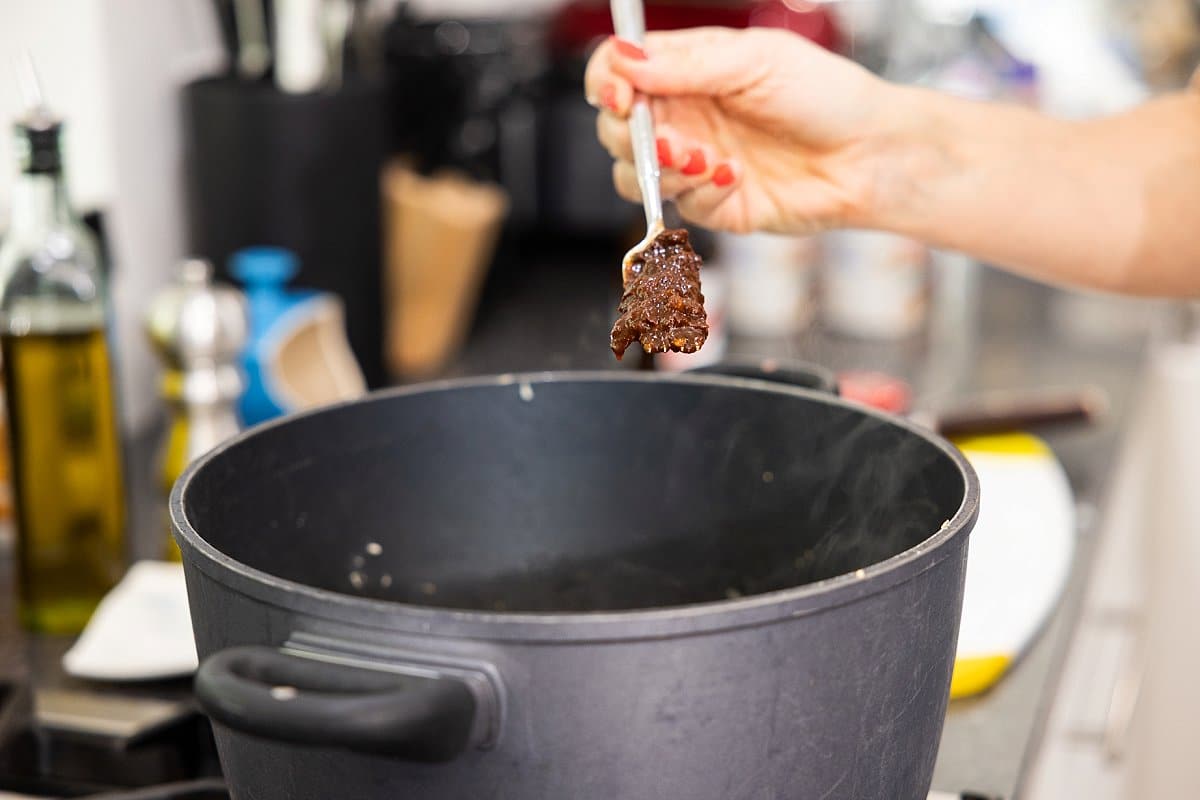 - Add beer to deglaze, scraping up brown bits on bottom of pan using a wooden spoon.