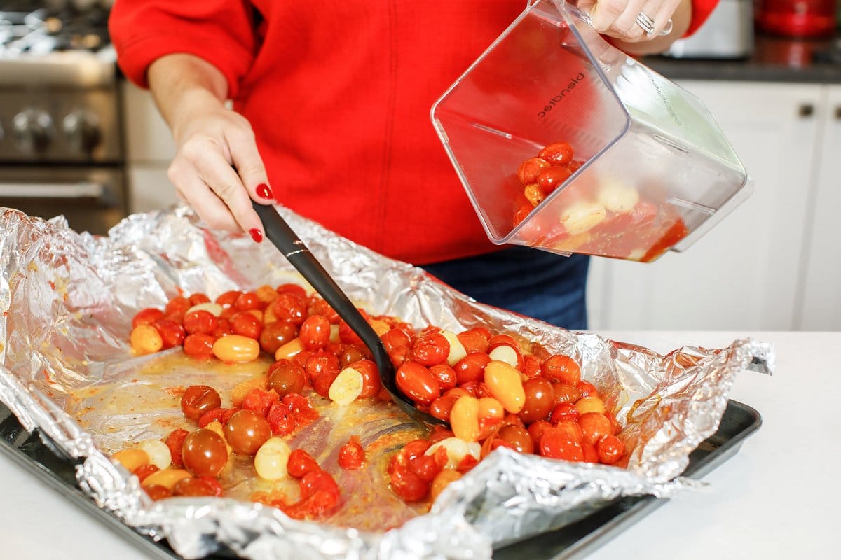 Once you’ve roasted the tomatoes, simply place them in a high speed blender (this is the blender I love to use!)