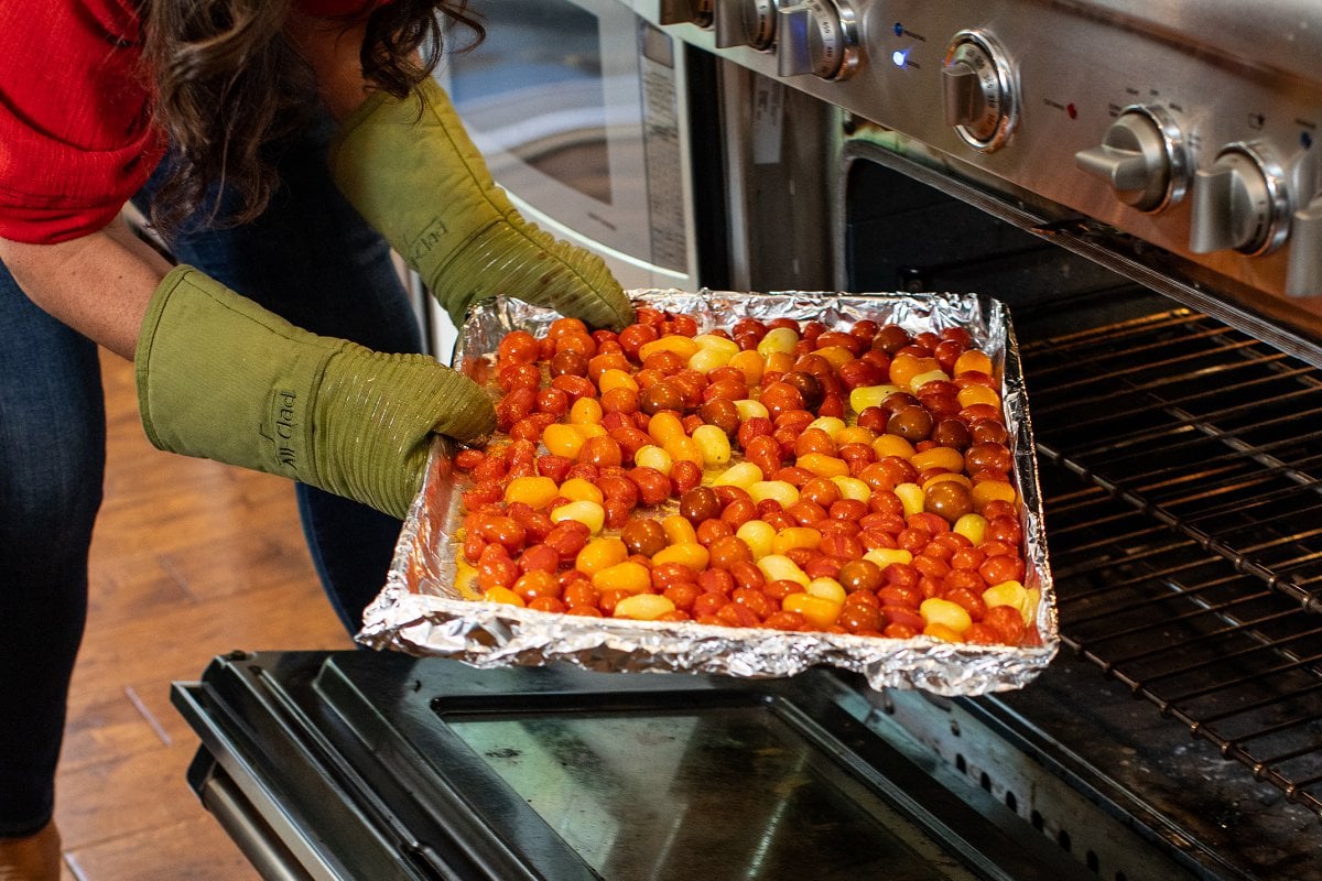 - Sprinkle SUNSET® tomatoes in an even layer on a baking sheet and toss with olive oil plus salt and pepper to taste. Roast until tomatoes start to soften and burst, about 20 minutes.