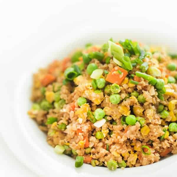 A healthy spin on the Chinese takeout classic, this vegetable fried rice is made with riced cauliflower then seasoned toasted sesame oil and fragrant ginger.