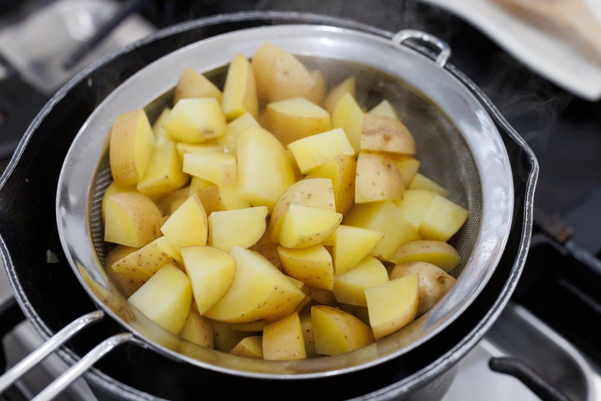 Start your vegetable hash breakfast skillet by chopping and par-boiling your potatoes.