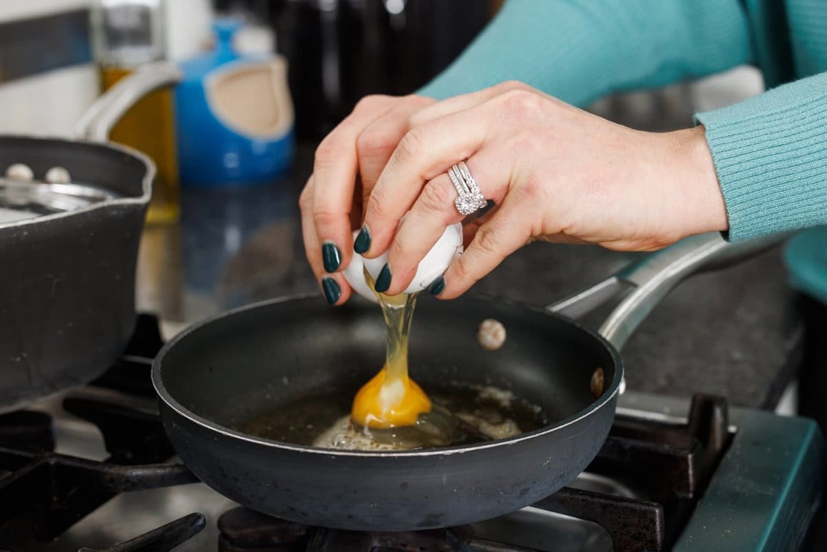 - While the veggies are cooking, cook four eggs to order. To serve, place the eggs on top of the veggie skillet and serve family style.4 eggs cooked to order