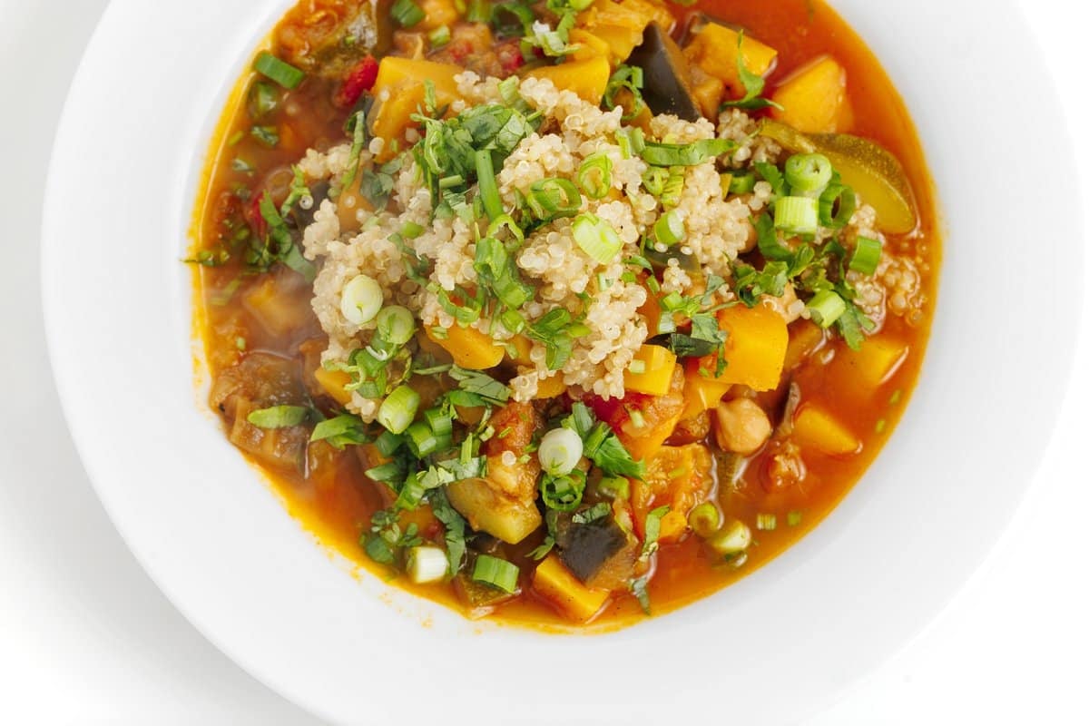 Once veggies are soft and tender, serve topped with couscous or quinoa and freshly chopped scallions. It’s also delicious topped with a creamy cucumber yogurt sauce. Enjoy your Vegetable Tagine with Chickpeas!