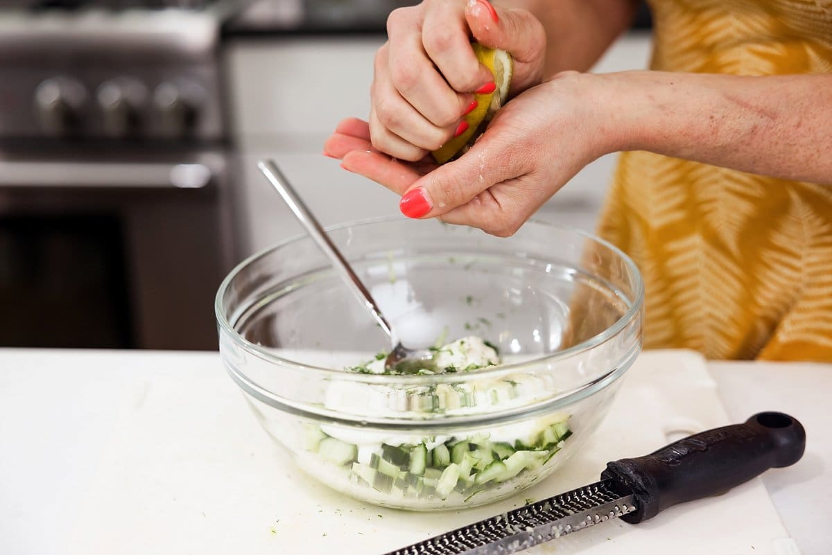 Stir all of the ingredients together and add more dill, lemon, garlic or salt/pepper if you wish. Be sure to see my tzatziki sauce recipe for a more detailed guide.