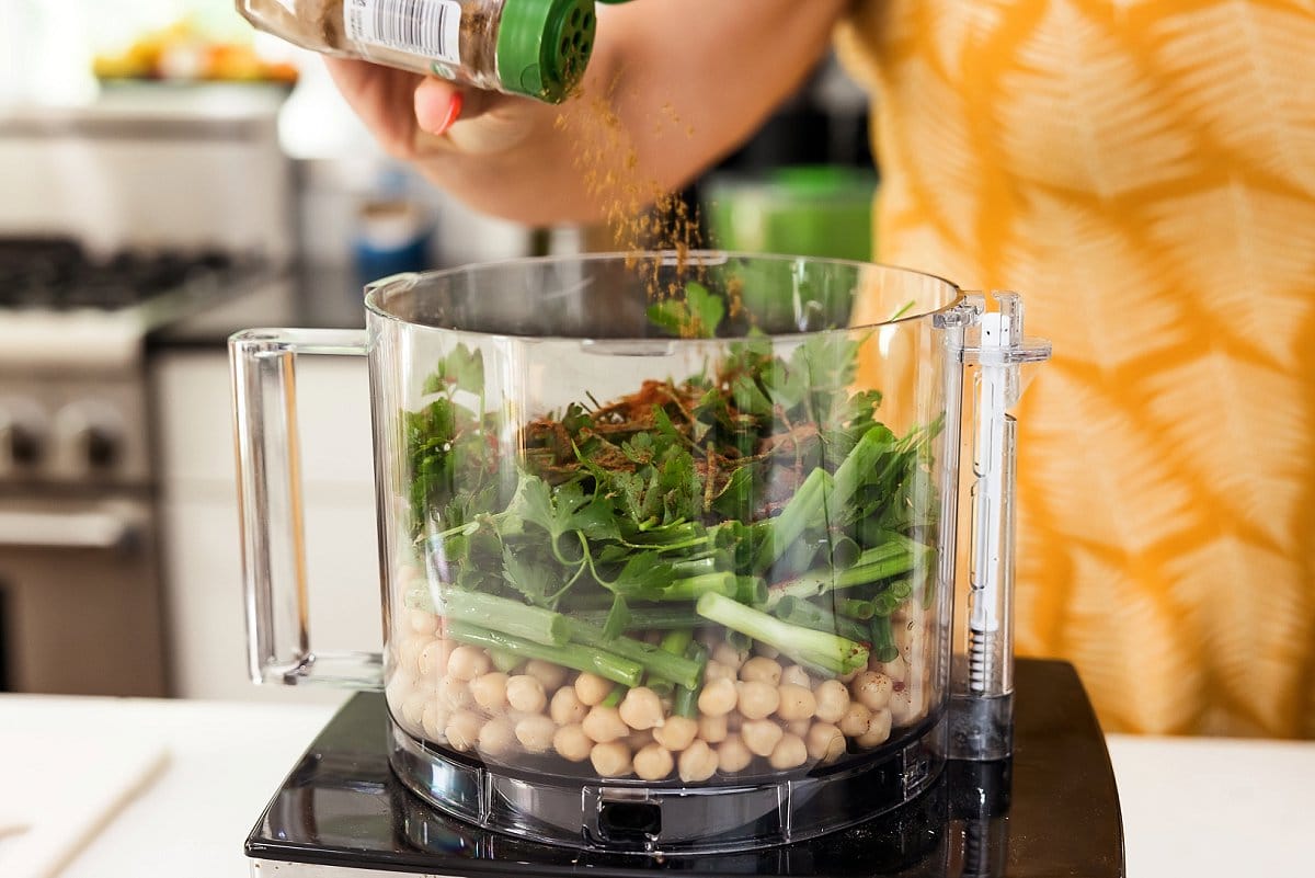 First, place canned chickpeas (be sure to drain and rinse), lemon juice and scallions in a high-speed food processor. Chickpeas are super high in protein and work as an excellent meat replacement in vegetarian recipes.
