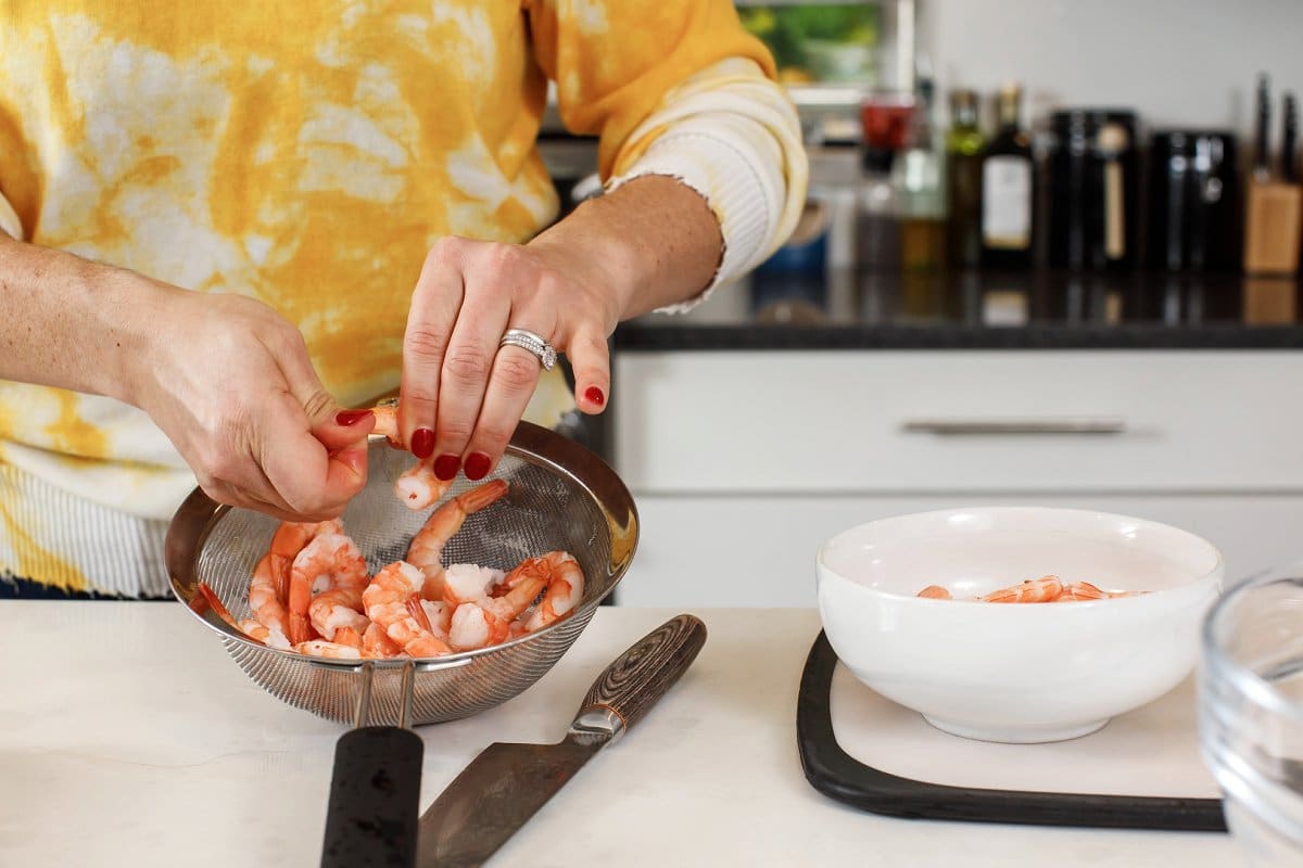 Cooked, peeled, and de-veined shrimp are easiest to use with this recipe. However, fresh or frozen varieties work as well. Just be sure they are completely thawed before use! To easily defrost frozen shrimp, fill a bowl with cold water. Then, let the shrimp rest in the water for 20-30 minutes. When thawed, place the shrimp on a plate and pat dry.