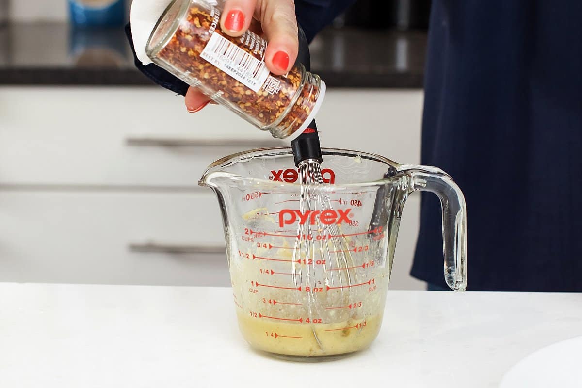 And finish with the chili flakes and a pinch of salt and pepper. Whisk until emulsified, then set in the fridge to chill.