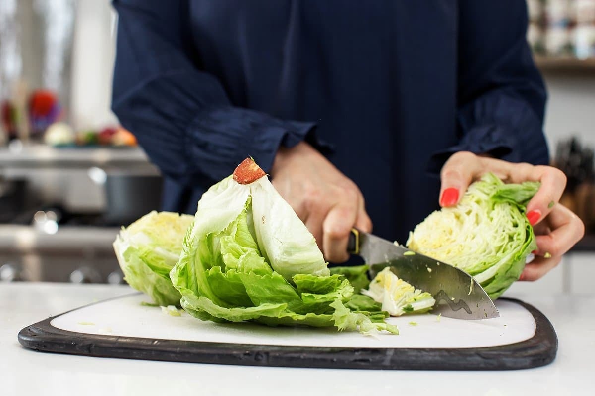 Keep the core intact, so you won’t cut off any ends like when you’re chopping lettuce for a salad. Cut the head of lettuce straight down the middle into 2 halves, then again into wedges!