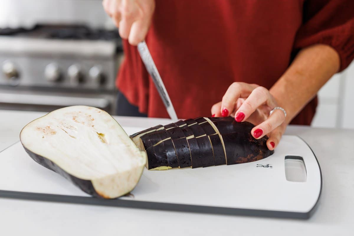 - Bake eggplant until tender, about 20-25 minutes; let cool slightly.