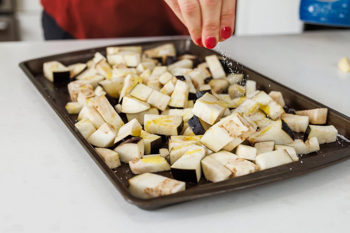 - Spread eggplant cubes on baking sheet in one layer and drizzle with half of the olive oil (two tablespoons), half of the salt (1/2 teaspoon) and half of the pepper (1/4 teaspoon). Use hands to mix around to make sure cubes are evenly coated with oli and spices.