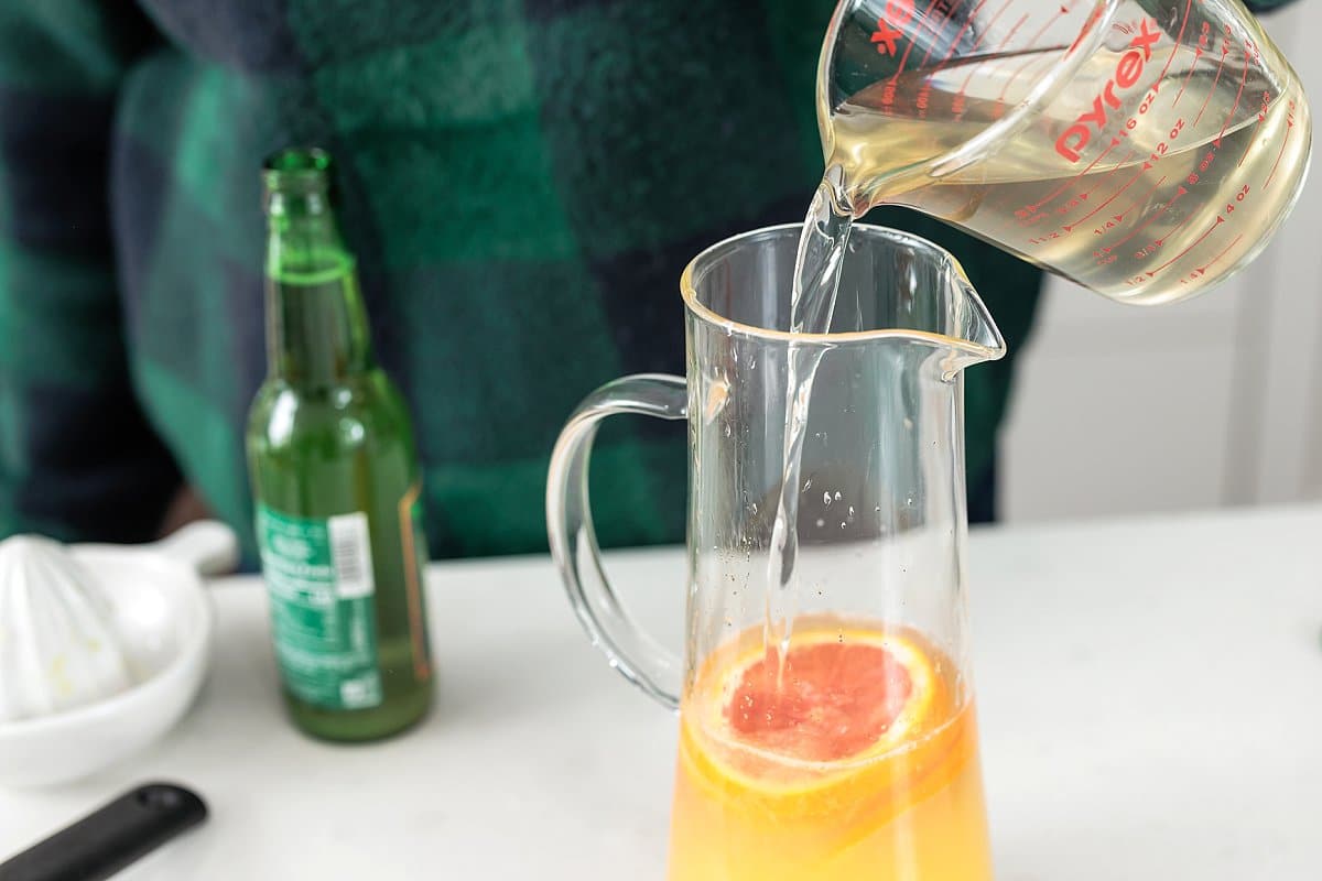 - Once ginger simple syrup has cooled, strain ginger root from the mixture and add the syrup to the pitcher of wine and citrus juice. Stir well and let mixture chill for 4 hours or up to overnight.