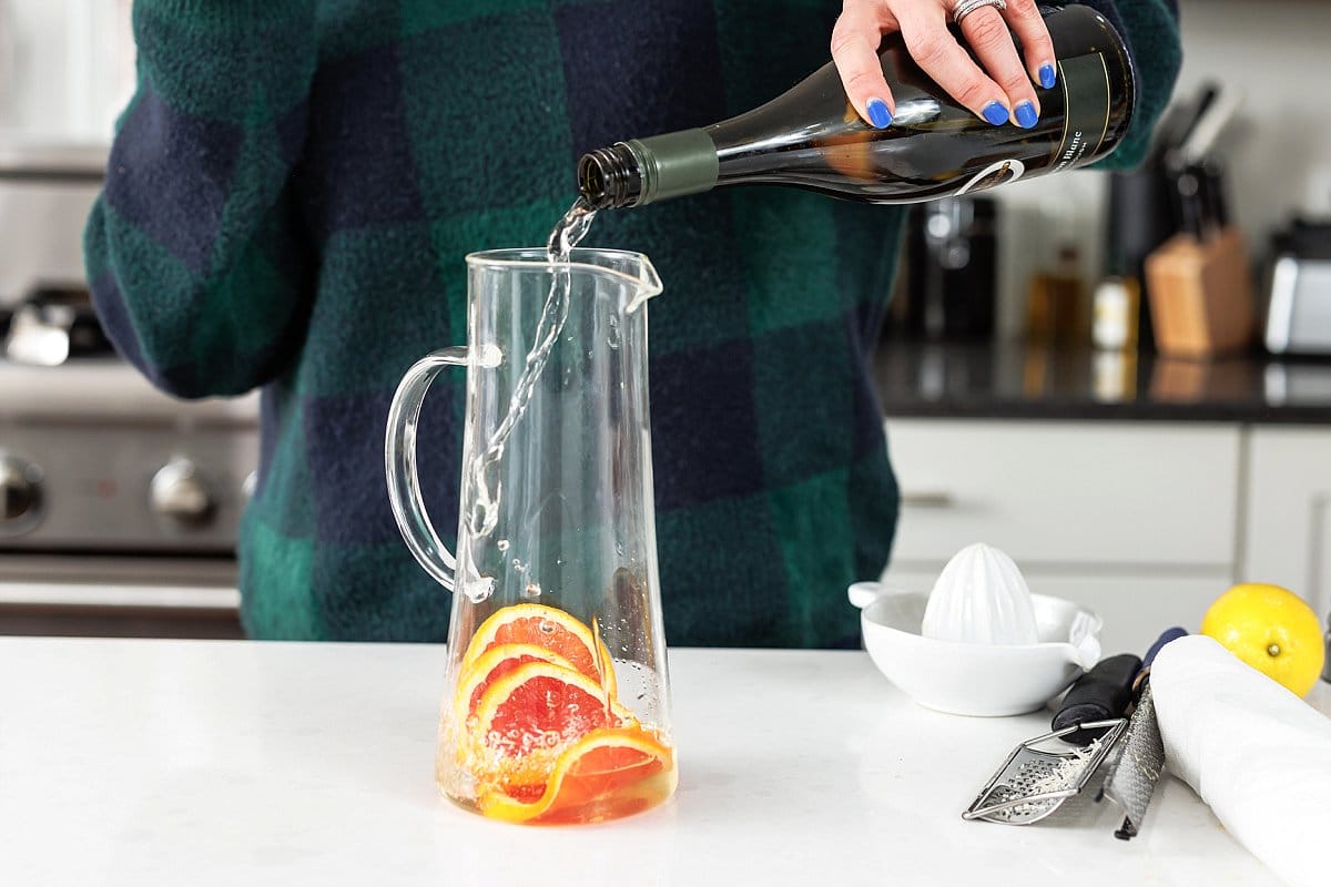 Then in a large pitcher, pour in your choice of white wine. I added orange slices for fun, and is totally optional.