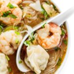 Check for seasoning and add salt or pepper to taste. Divide cooked rice noodles between four bowls and ladle shrimp and wonton soup mixture on top. Garnish with cilantro, sliced onion, jalapeno slices, hoisin and sriracha if you wish.
