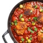 In a large Dutch oven or cast iron skillet, heat olive oil over medium high heat. Season chicken thighs evenly on both sides with salt and pepper. Skin side down, sear chicken in pan until a golden brown crust forms, about 5-7 minutes.