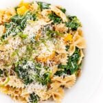 Toss in roasted butternut squash, cooked pasta, Parmigiano-Reggiano and minced parsley. Check for seasoning and adjust accordingly.