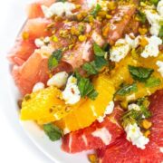 This quick and easy Winter citrus salad is topped with goat cheese, pistachios, mint and olive oil. Simple enough for a casual weeknight dinner but elegant enough for entertaining.