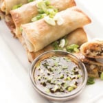 To assemble, lay egg roll wrapper on a clean surface and place 1/4 cup of the filling in the center of the wrapper. Brush water along all four borders of the wrapper then begin rolling like a burrito: start with the bottom and fold over the meat mixture then fold the right and left sides over before finishing to roll tightly.