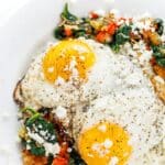 Veggies are sautéed in olive oil and seasoned with Greek spices before being topped with creamy feta and a fried egg. The ultimate high protein, low carb breakfast!