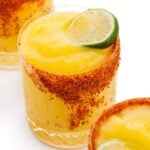 Dip the rim of each glass in water or rub a lime wedge around the edge to moisten. Pour chili lime salt into a small plate and dip each glass to line rim; set aside.