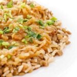 Fluff lentils and rice with a fork before serving with caramelized onions. Serve with plain yogurt or Lebanese Cucumber Laban if you wish.