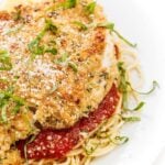 Bake chicken until tender and crispy, about 20 minutes. Serve over pasta with your favorite red sauce if you wish.