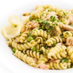 This easy salmon pasta recipe is made with fresh pesto, roasted salmon, green peas, and a splash of bright lemon juice. Enjoy this incredible salmon pasta warm, cold, or room temperature.