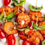 The ultimate no-cook party bite, these smoked shrimp caprese skewers are the perfect bite-sized appetizer. Made with juicy tomatoes, creamy mozzarella, fresh basil and smoked shrimp, these skewers are naturally high protein, gluten free and low carb.