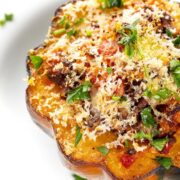 Scoop farro and chorizo mixture into all four halves of the squash. Feel free to fill the squash up high!