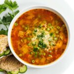 Add bell peppers to the pan, along with oregano and garlic, and saute until tender, another 3-4 minutes. Stir in diced tomatoes and another pinch salt and pepper. Saute 2 minutes before pouring in vegetable broth. Bring to a boil then add peas. Heat to a boil again then reduce to low and simmer for 10-15 minutes,