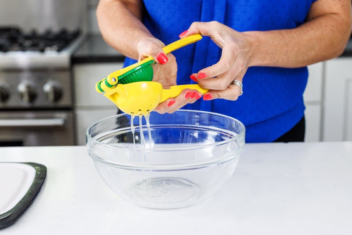 Start your za’atar spiced grilled chicken by making the marinade. First juice your lemon into a large bowl.