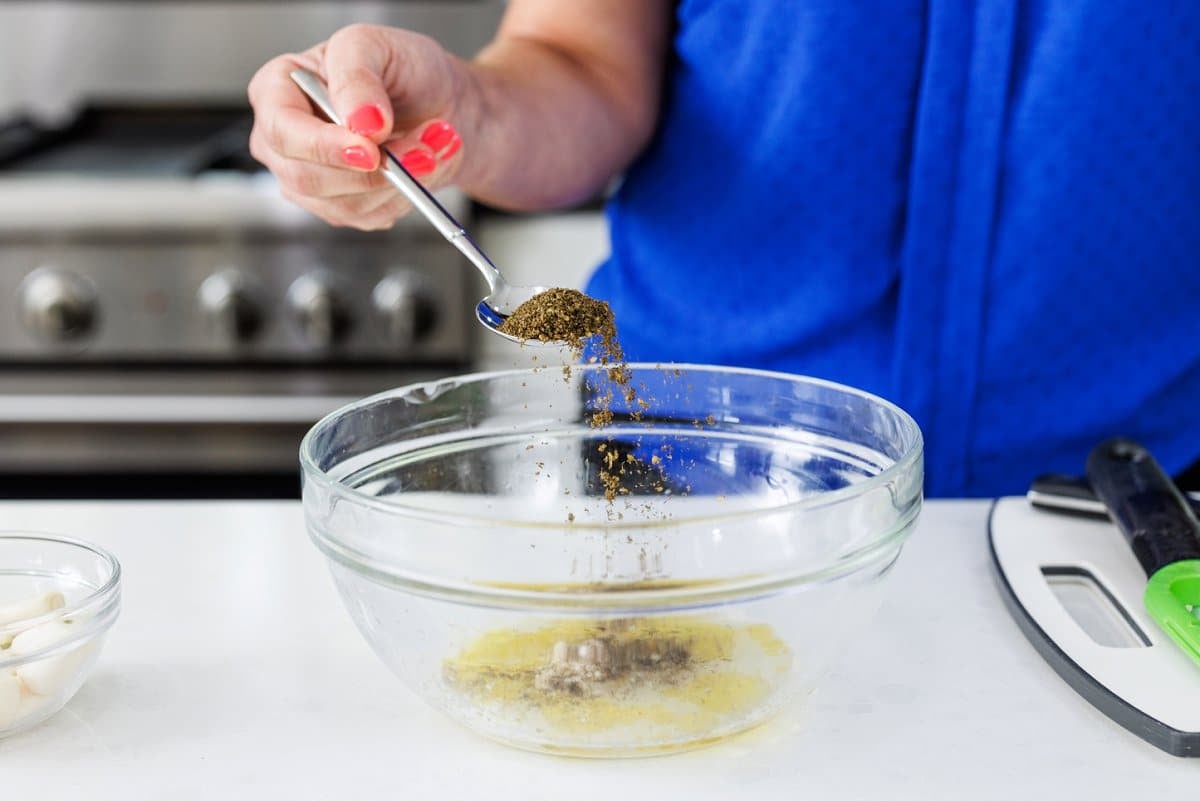1/4 cup extra virgin olive oil, 1/4 cup lemon juice, 1/4 cup za’atar, 4 cloves garlic, 2 teaspoons salt, 1 teaspoon pepper