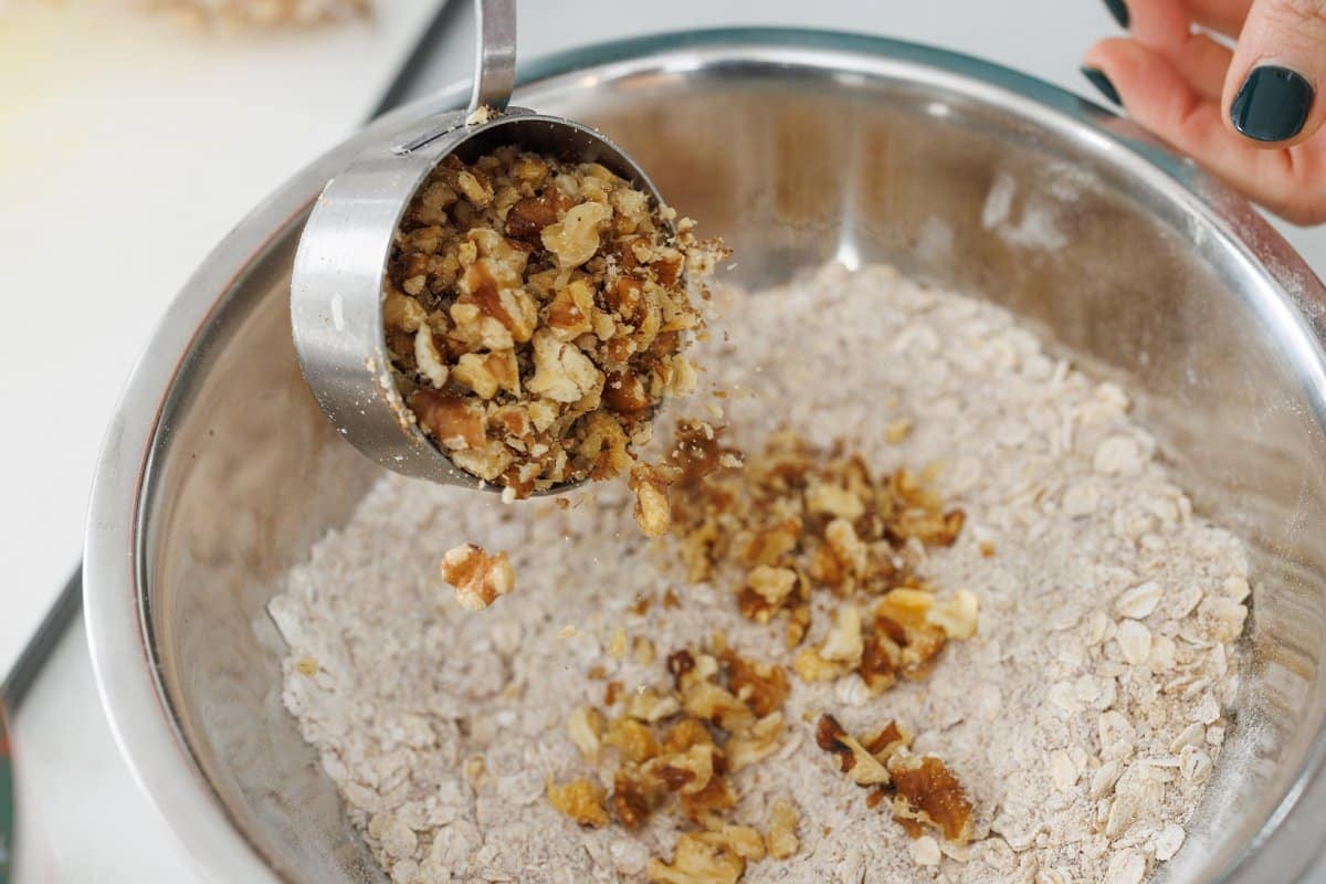 - Once the dry ingredients are mixed well, add in the walnuts and use hands to make sure they are all evenly coated with the floury ingredients. (This will help them float in the muffins!)