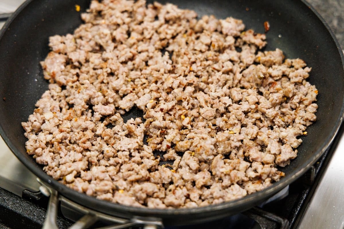 Step 1. Cook your sausage over medium-high heat in a large skillet, crumbling into small pieces.