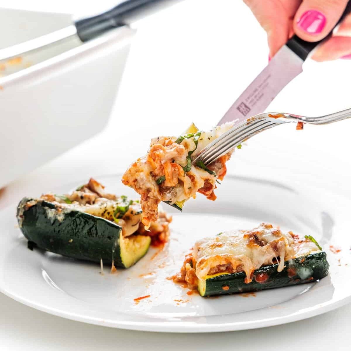 - Remove zucchini from oven and pat any moisture that may have accumulated with paper towel. Spread about two tablespoons of marinara sauce in the middle of each zucchini half then top with cooked Italian sausage crumbles, mozzarella cheese and a sprinkle of parmesan. Repeat until all halves are filled then bake for 5 minutes before turning oven to broil then broiling for 3-4 minutes until golden brown. Serve with optional garnish of fresh basil and chili flakes.1 cup marinara sauce, 16 ounces shredded part-skim mozzarella, 1/4 cup grated Parmesan cheese, fresh basil and chili flakes